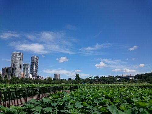 6月末に早々に梅雨明けし、猛烈な風で日傘もさせず、夏の日差しが照りつける不忍池。まだ蓮が咲き始めの頃でした。 風、強すぎ。 強風のため、本館の正面の扉を閉鎖していました。