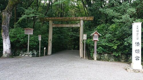 内宮と外宮を結ぶ御幸道路の中ほどにある倉田山の山頂、倭姫宮交差点から少し下ると大鳥居が立っている。鋼鉄製の伊勢鳥居。ずっと下れば内宮に至ります。 東側には黒門(旧福島御塩焼大夫邸門)がある。 西を向くと倭姫宮の社号標と一之鳥居がある。伊勢鳥…