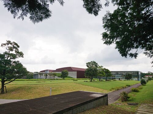 出雲大社の東にある古代出雲歴史博物館に行きました。 摂社命主社に寄った後だったので、裏の広い庭園をながめながら建物に向かいます。 山々の緑と赤い鉄板のコントラストが美しい。たたら製鉄を象徴して壁面に鉄を使っているそうです。 正面側はガラスの壁…