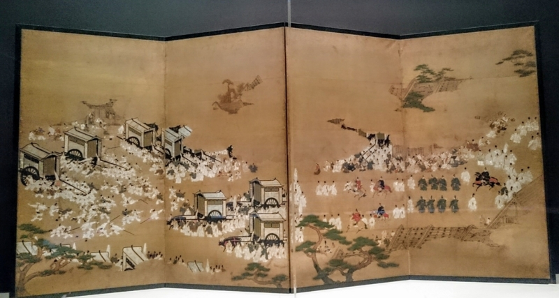 元は襖絵だったものを4曲1隻の屏風にしたもので、源氏物語の葵の巻、車の所争いを画題としたもの。賀茂川で行われる御禊に出る光源氏の姿を一目見ようと、正妻の葵の上の車が地位と身分に物を言わせて他所の車を立ち退かせます。その相手が六条御息所の網代車(あじろぐるま)だったというシーン。右隻には御禊の厳かな行列があり、左隻には見物の車が並ぶ。左端から二台の車が騒動していて、それを野次馬が囲んでいる。