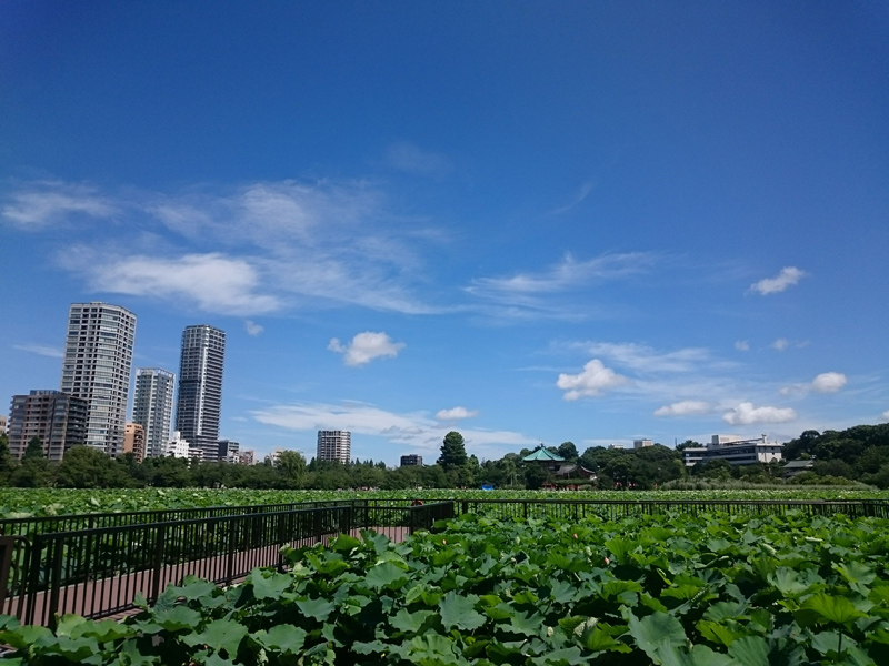 6月末に早々に梅雨明けし、猛烈な風で日傘もさせず、夏の日差しが照りつける不忍池。